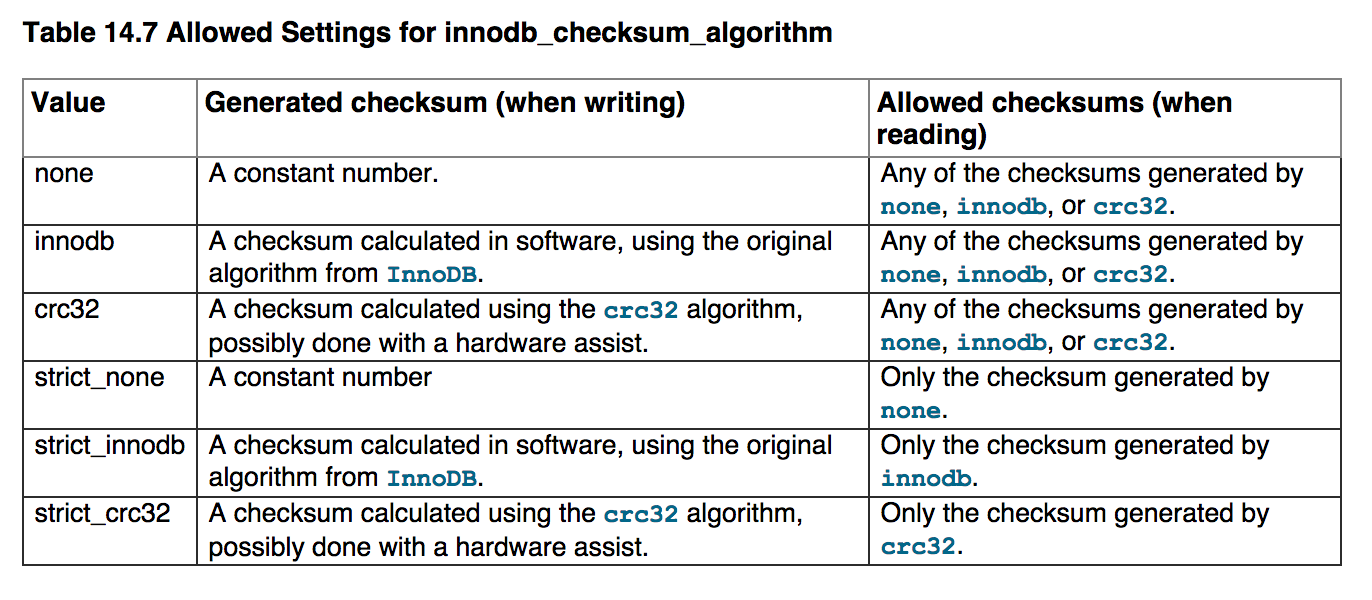 I got confused about none algorithm. Although the table hints that a page stores a hard-coded value that’s being checked while reading, actually none means checksums are disabled. This is what the manual says further on though.