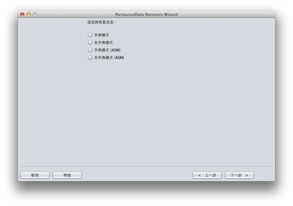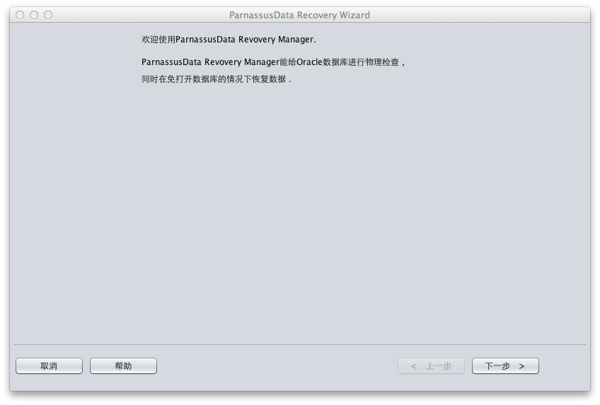 PRM-DUL采用GUI图形化界面(如图1)简单方便。使用者无需额外学习一套命令,或者了解ORACLE的底层数据结构原理即可以通过恢复向导(Recovery Wizard)来恢复数据库中的数据。